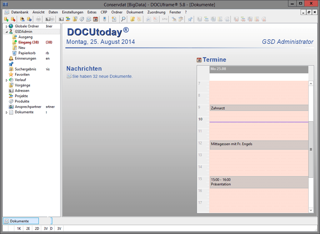 DOCUtoday ist der Startbildschirm von DOCUframe® und informiert den Benutzer u.a. über die Termine des heutigen Tages und über Anrufe in Abwesenheit. Zusätzlich kann das Fenster so konfiguriert werden, dass von hier aus bestimmte neue Dokumente, wie z.B. E-Mails, Faxe oder Word-Dokumente, erzeugt werden können.