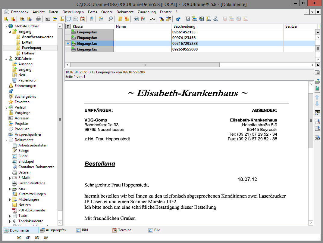 DOCUframe® bietet Ihnen die Möglichkeit alle Dokumente auch aus anderen betriebswirtschaftlichen Softwarelösungen, direkt von Ihrem eigenen Arbeitsplatz ohne Qualitätsverlust zu faxen und dies auch als Serien- bzw. Rundfax. Zudem kann ein empfangenes Fax weiterverarbeitet und mit grafischen Objekten wie z.B. Unterschriften und Notizen versehen werden.