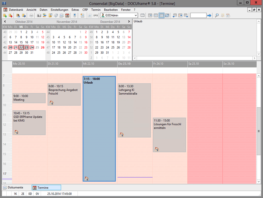 Die Verknüpfung zu zeitlichen Abläufen zieht sich durch alle Funktionsmodule, wie ein roter Faden. Die Zeitschiene ist somit das Rückgrat aller Kontroll-, Verwaltungs- und Organisationsmechanismen. Am augenscheinlichsten tritt dies beim ausgefeilten Terminsystem von DOCUframe® zu Tage. Alle Termine stehen in Wochen-, Monats- oder Tagesformat wahlweise in grafischer oder tabellarischer Form zur Verfügung. Vielfältige Erinnerungs-, Wiedervorlage- oder Ereignisfunktionen stehen hierbei in direkter Verbindung mit den internen Vorgangs- und Projektsteuerungsmechanismen des Systems. Aber auch alle Formen von Dokumenten können zeitkritisch verwaltet werden. Ob per SMS oder E-Mail: DOCUframe® sorgt an jedem Ort dafür, dass Sie Ihre Termine und Zeitvorgaben einhalten.