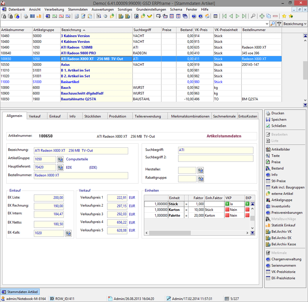 ERPframe® verwaltet bezogen auf einen Artikel beliebig viele Stücklisten, wie beispielsweise Set-, Beleg-, Ersatzteil-, Produktions- und Artikelstücklisten. Allen Stücklisten kann eine beliebige Anzahl von Ebenen zugewiesen werden. Ebenso ist eine Stammdaten- und Merkmalsverwaltung (Verwaltung von Farben und Größen) integriert.