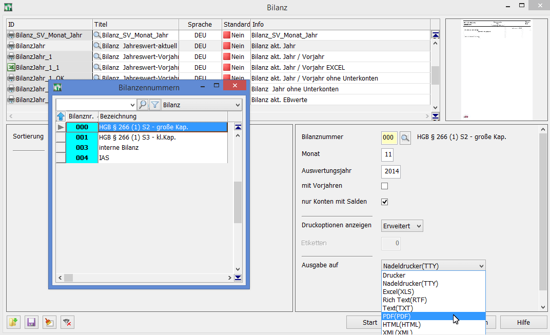 - Hauptabschlussübersicht, Bilanzen, Gewinn- und Verlustrechnung (GuV), Summen- und Saldenlisten, Kontoblätter